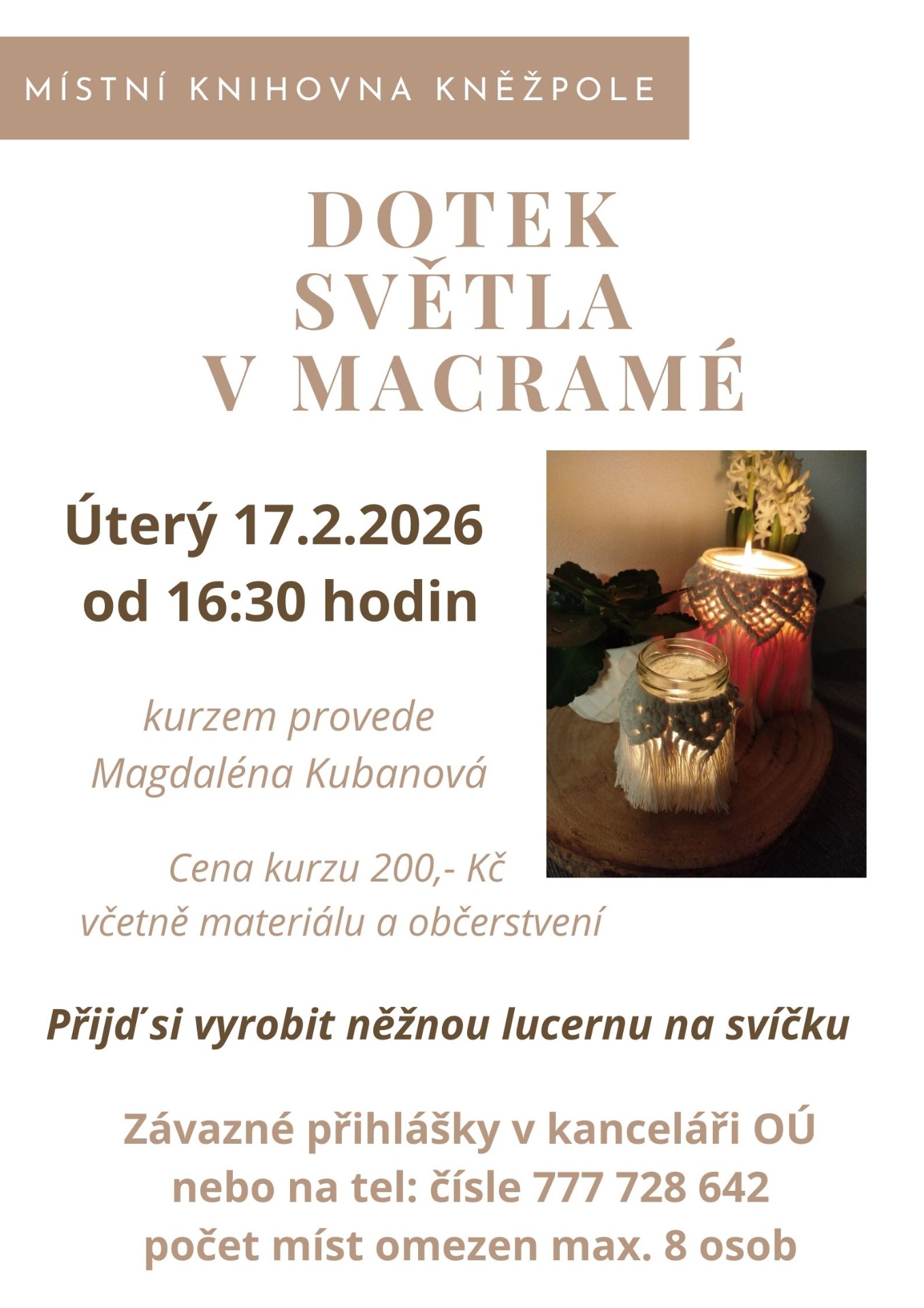 Místní knihovna Kněžpole srdečně zve na kurz MACRAMÉ. Přijď si vyrobit něžnou lucernu na svíčku.
